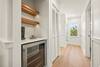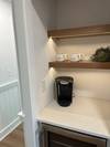 Level 1 hallway coffee bar with a mini fridge — perfect for morning brews or evening refreshments